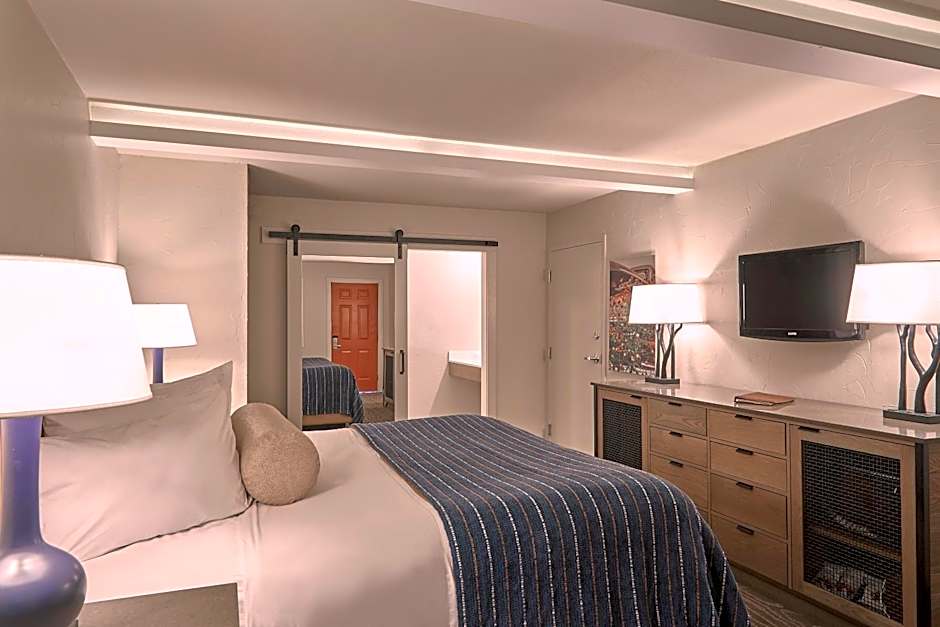 A 50" flat-screen TV is featured in this room. This room faces the resort style pool area and Barons Creek which include a wood burning fire place and gas fire pit. The room includes a microwave, refrigerator, coffee maker, blow dryer, iron and ironing board.